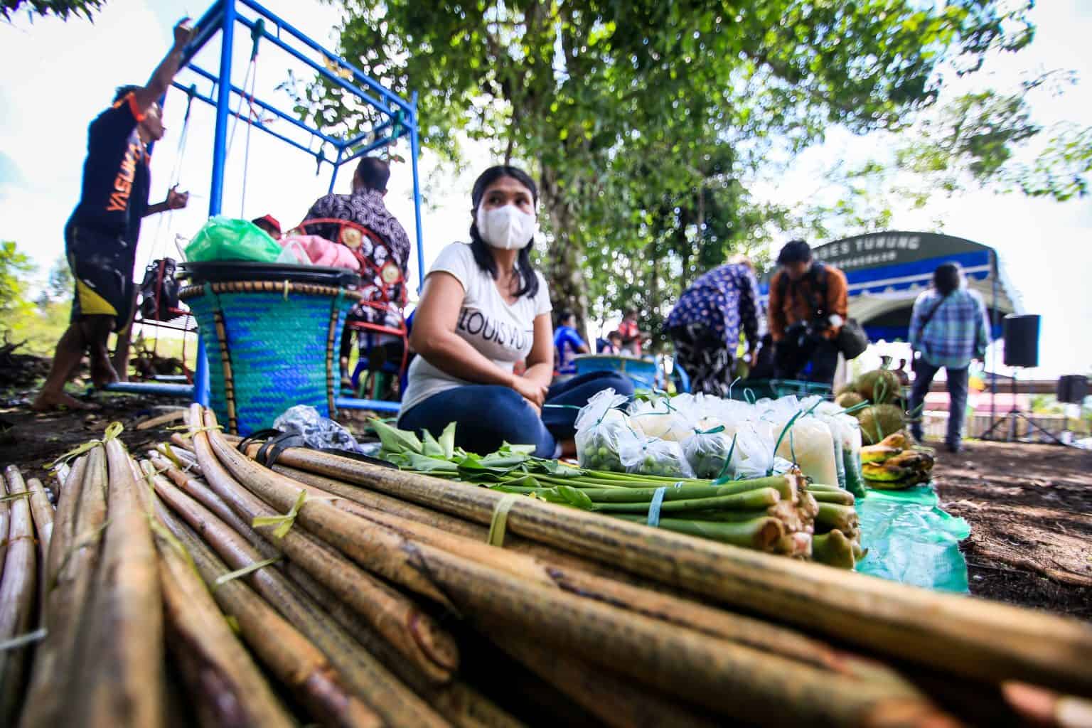 It wasn’t just food on offer at this year’s Forest Food Festival, but handicraft booths, including flower crafts made from plastic waste, agarwood carvings, and woven purun (a type of swamp grass) and rattan. Those in attendance were also treated to traditional music and dance performances by local children, as well as a mime show from Abdul Khafidz, who was dressed all in white and carrying a hoe like a farmer.