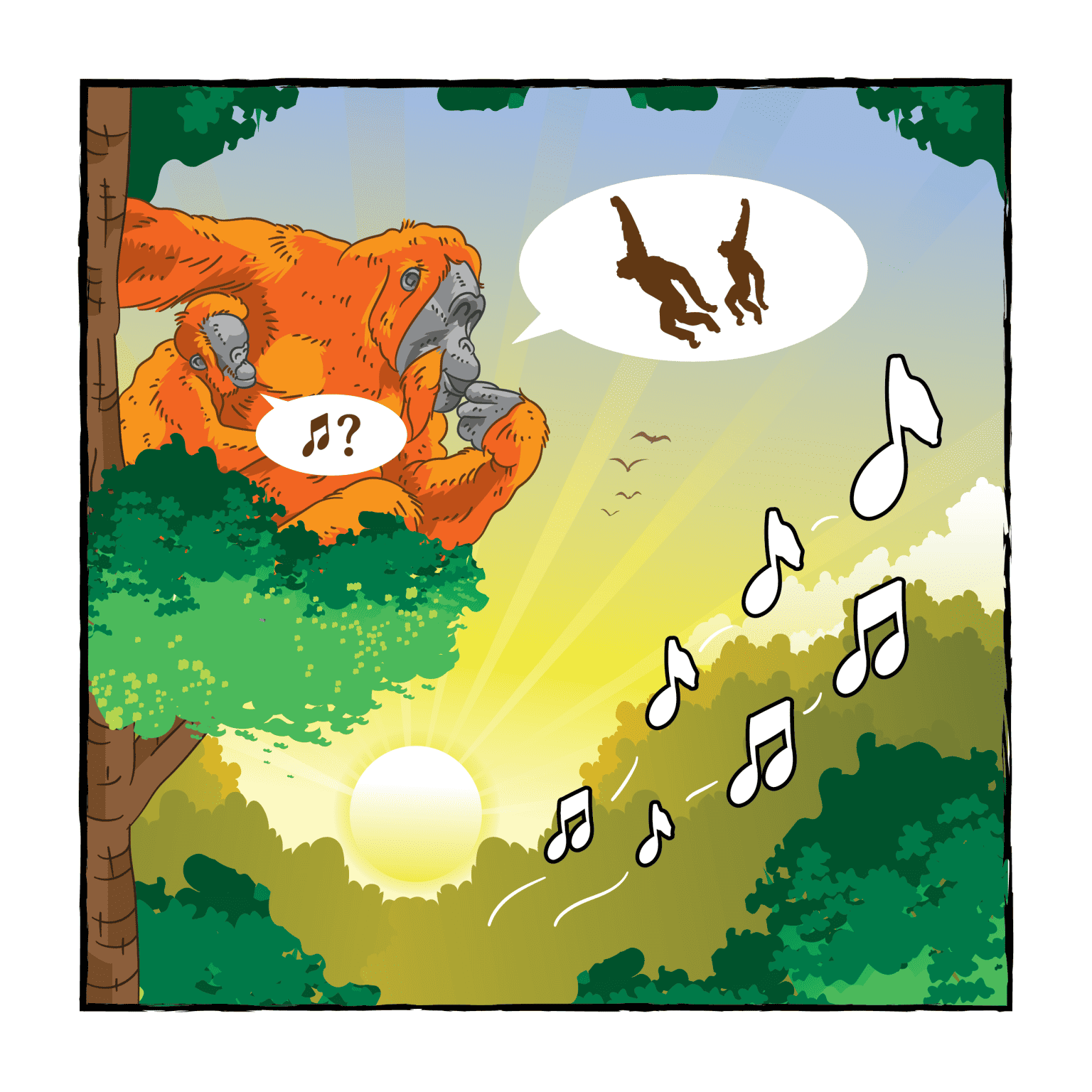 A short while later, Popy was startled by the arrival of a mysterious animal, smaller than his fellow Orangutans, with long, gangly arms.
