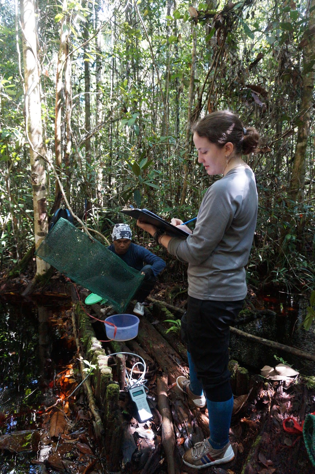 Sara collecting data with her field assistant, Dudin, in the Sabangau Forest. Photo by Sara Thornton/OuTrop.