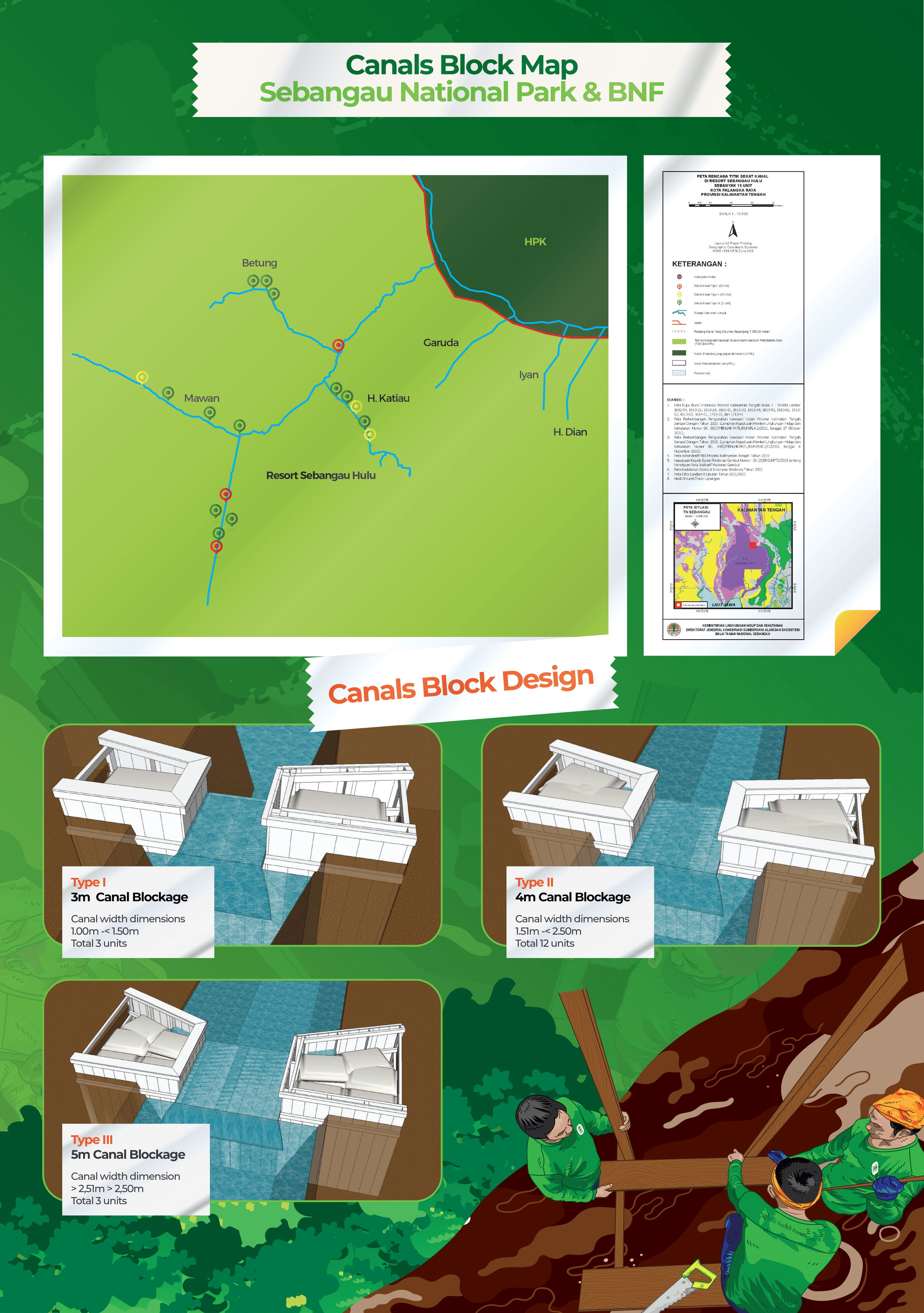 Building dams is part of our integrated strategy for restoring the degraded peatland. Peat re-wetting helps to fire-proof the forest and improves ecosystem health, benefitting both people and wildlife. Until October 2022, 18 dams have been built in four canals namely Betung Canal, Mawan Canal, H. Katiau Canal and Pakudan Canal until October 2022.