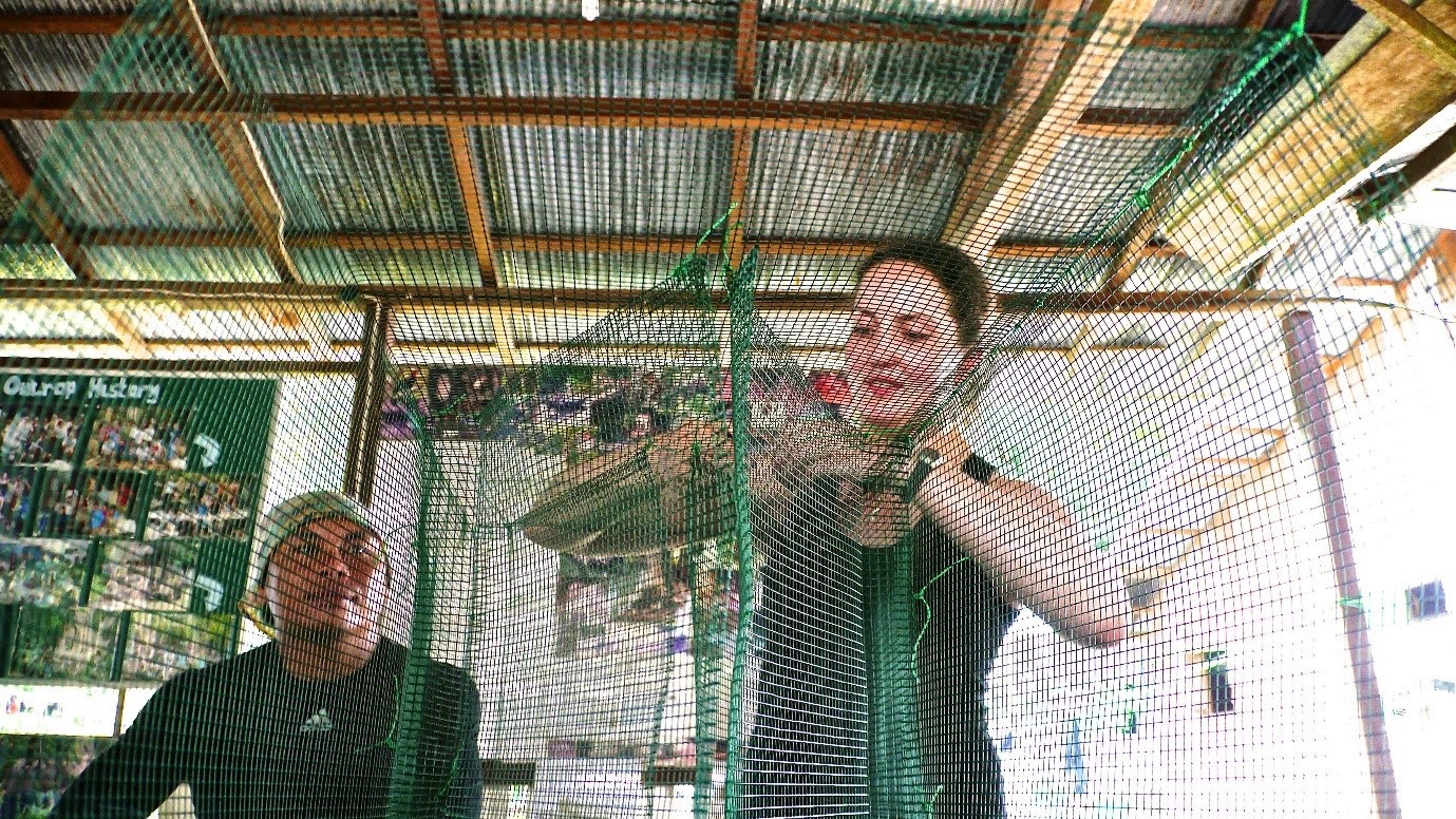 | Fixing a fish trap while local fisherman and project assistant, Dudin, looks on. Photo by Julie Lasne/OuTrop |