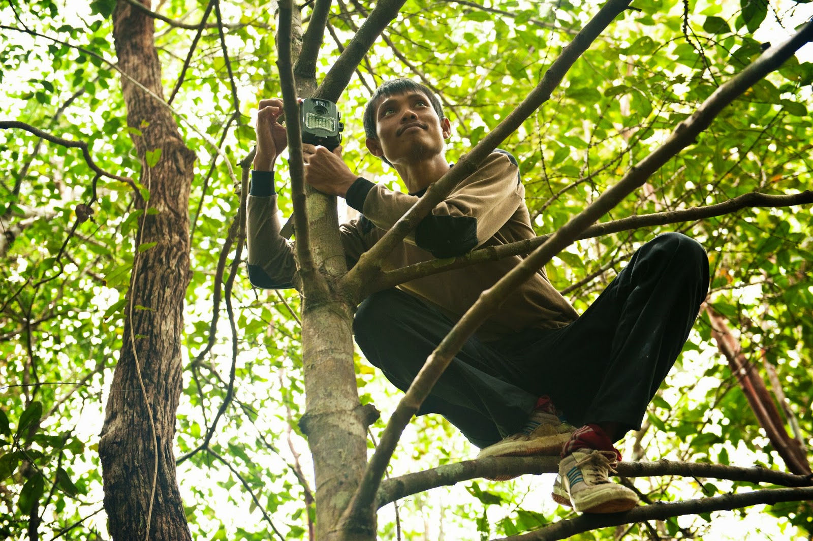 | Adul finds a good location for the canopy camera trap. Photo by Chris Owen/OuTrop. |